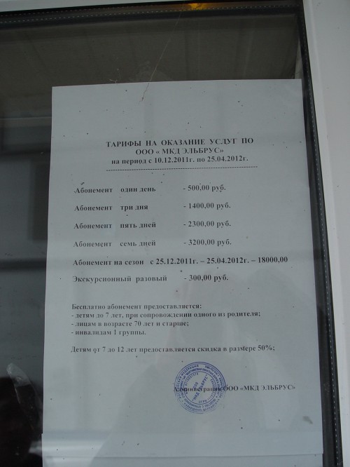 Официально объявлены цены на канатную дорогу. В этом году работники старой канатной дороги в Азау и на Чегете взяли правление в свои руки. Теперь ценовую политику им диктуют не с верху,они решают сами как лучше заработать себе на зарплаты. Поэтому цены существенно упали. Например, дневной абонемент на Эльбрусе будет стоить 500р., на Чегете — 600р., а на новой канатке подороже, 800 или 900 р.