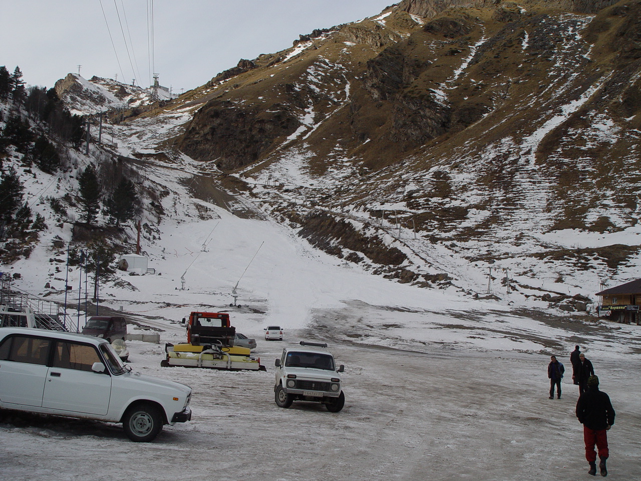 Сейчас внизу в Азау снега достаточно для того, чтоб учиться делать первые шаги на лыжах и досках, а выше Кругозора и на Чегете до Ая можно вполне хорошо кататься по трассе.